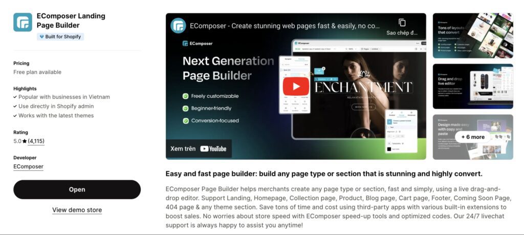 EComposer, launched in 2022, is a drag-and-drop page builder and website design Shopify app designed to help Shopify merchants create stunning and highly converting pages without coding knowledge.