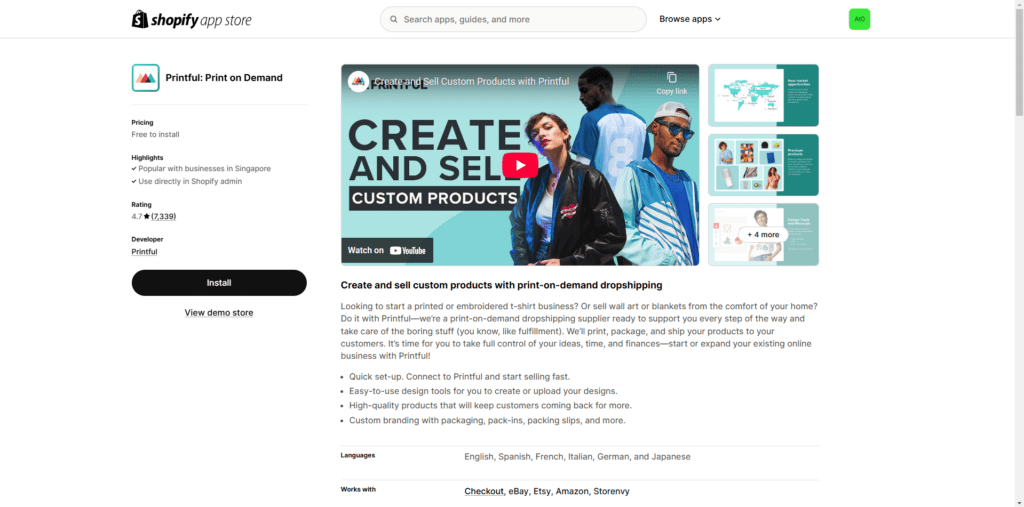 Printful is a comprehensive print-on-demand dropshipping supplier that allows you to create and sell custom printed products—from t-shirts and wall art to blankets—without inventory concerns. Printful handles the printing, packaging, and shipping directly to your customers, giving you more time to focus on growing your business.