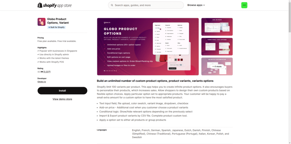 Pros: Eliminates Shopify’s variant limitations, increases sales through product personalization, offers multiple customization options, works with other popular apps like Smart Product Filter & Search, and supports 15 languages for global stores.