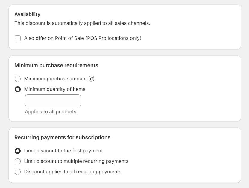 – Amount off orders: Enable discounts (either a fixed amount or percentage) on the total order value.