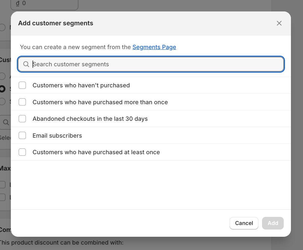 If you want to offer an automatic discount to specific customer segments, Shopify’s native tool doesn’t support this feature. The only solution is to use a third-party discount app. These apps provide advanced segmentation options, including: