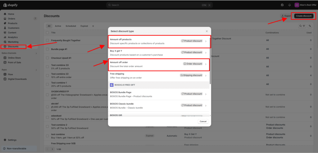 Step 1: Visit your Shopify admin dashboard > Click Create discount > Choose between “Amount off products” or “Amount off order”. In thi case, i will choose “Amount off products“.