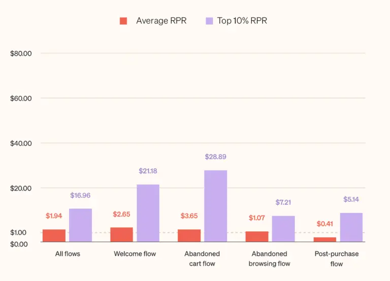 Basically, the red bars show average Revenue Per Recipent (RPR), and the purple bars show top 10% RPR for that flow. Essentially, it highlights how the best email senders (the top 10% performers) significantly out-earn the average sender for each flow type.