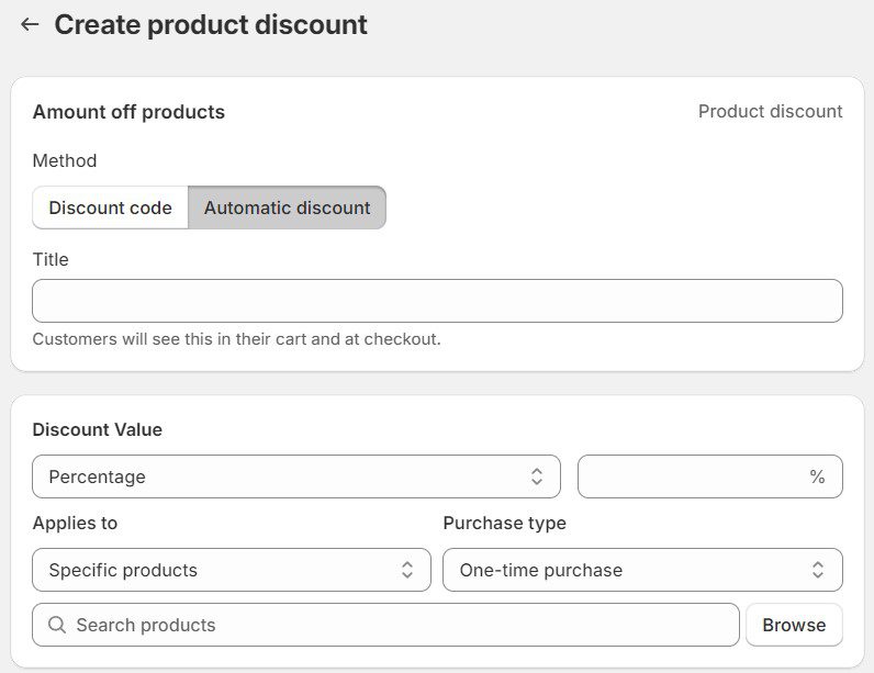 Step 2: Choose between 2 discount types: automatic discount and discount code as you wish. Give it a title for public display on the cart page and at checkout.