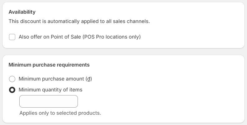 Step 3: The discount is automatically applied to all of your available sales channels, but you can also offer it on Point of Sale. Fill in the minimum purchase requirements by selecting between a monetary threshold or a number of products.