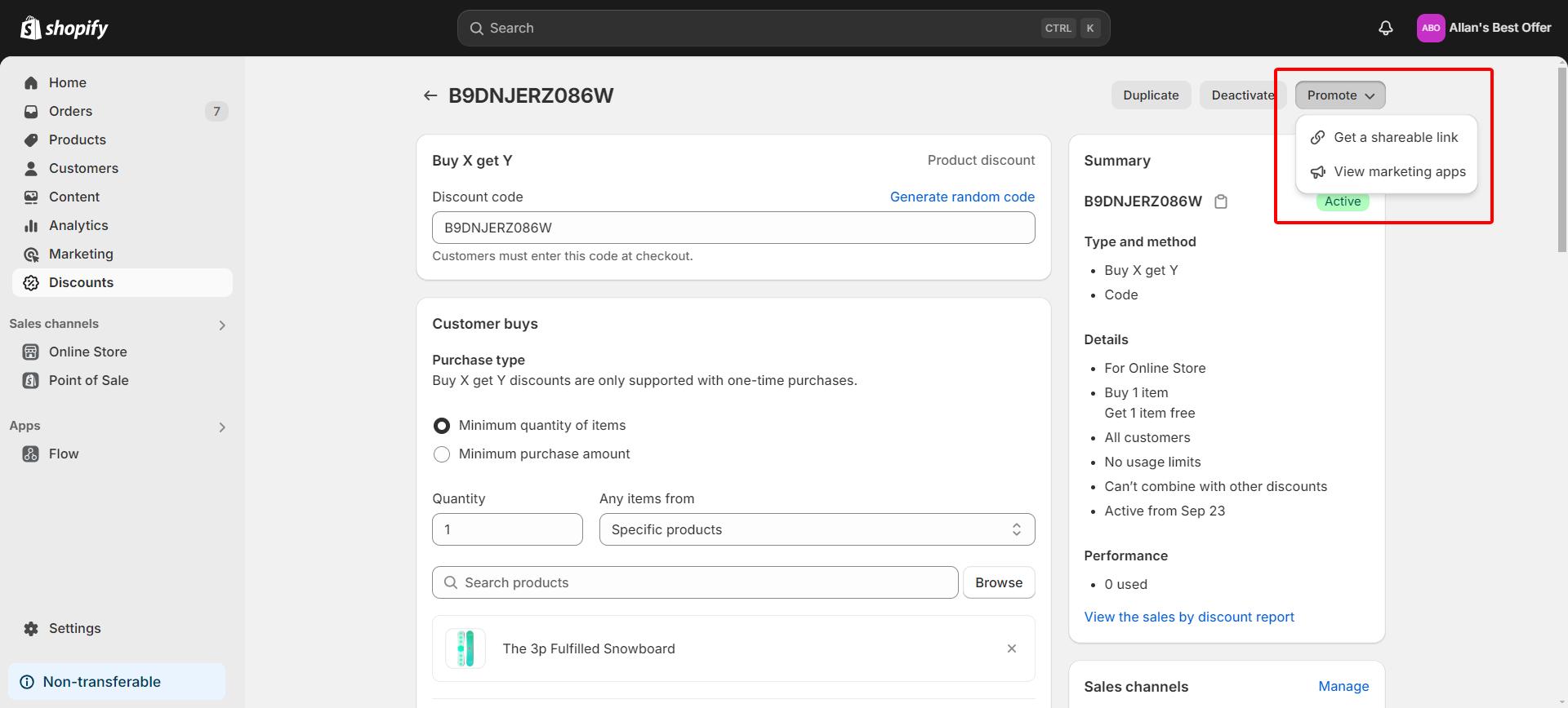 When you successfully set up a discount code, Shopify offers an extra Promote feature. This feature involves getting a shareable link and viewing available marketing apps.