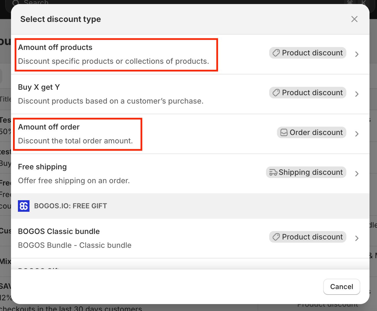 Click the Create Discount button and choose either Amount off products or Amount off orders, depending on your goal.