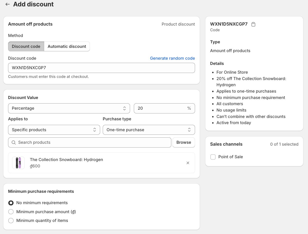 Click Save to activate the discount. Share the discount code with your customers or promote it via marketing campaigns.