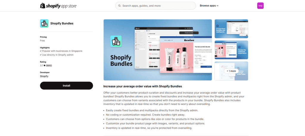 Shopify Bundles works particularly well for small to medium-sized merchants who need basic bundling functionality without complex configurations. It’s especially valuable for businesses selling on multiple channels including Amazon, where inventory synchronization is critical. If you’re running a clothing store with mix-and-match collections or a beauty brand offering product sets, this official app provides a solid foundation without requiring additional app subscriptions.