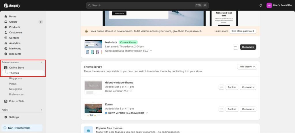 Navigate Sales channels > Online store > Themes in your Shopify admin dashboard.