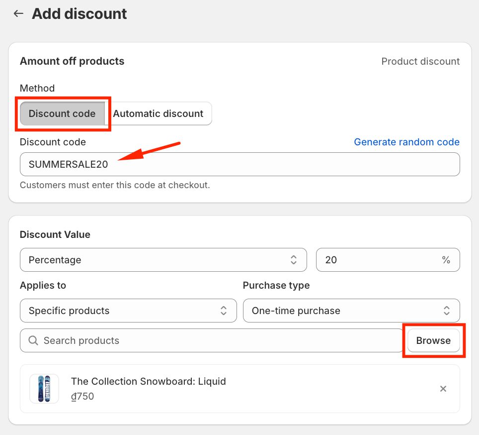 – Select Discount code as the method.